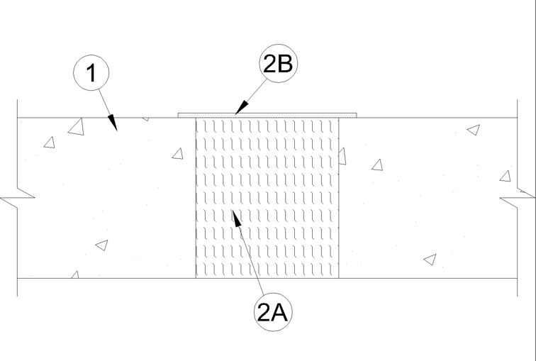 B. Fill, Void or Cavity Material* — Min 1/8 in. (3.2 mm) wet thickness fill material sprayed or troweled into joint to completely cover forming material (Item 3A). Material to overlap a min of 1/2 in. (13 mm) onto floor. As an alternate, min 1/4 in. (6 mm) thickness of fill material sprayed or troweled into joint completely cover forming material (Item 3A) flush with top surface of floor.