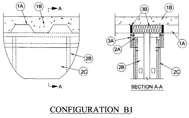 A.Steel Floor and Form Units* — Max 3 in. (76 mm) deep galv fluted floor units.B.Concrete — Min 2-1/2 in. (64 mm) thick reinforced lightweight or normal weight (100-150 pcf or 1600-2400 kg/m3) concrete, as measured from the top plane of the floor units.