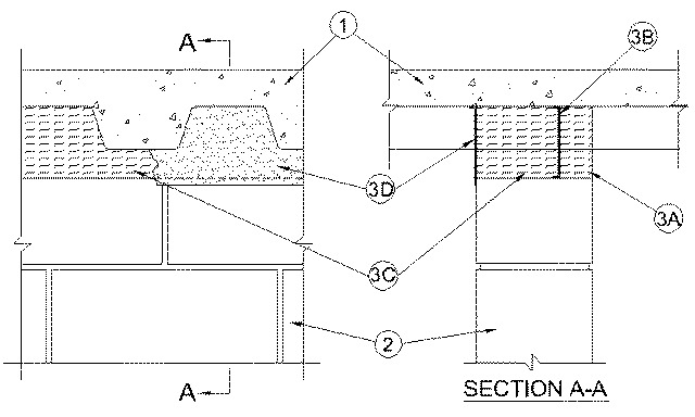 A.Forming Material — Nom pcf (64 kg/m3) mineral wool batt insulation, min 2 in. (51 mm) wide, compressed and firmly packed to fill the flutes and the gap between the top of the wall and bottom of the floor or roof as a permanent form on one side of the wall. Batt insulation cut to the shape of the fluted steel deck, approx 33 percent larger than the flutes. Pieces compressed and installed cut edge first into the flutes above the top of the wall. Additional pieces of batt insulation, min 2 in. (51 mm) wide, installed edge-first into joint opening between bottom of fluted steel deck and top of wall, parallel with joint direction, such that batt sections are compressed min 50 percent in thickness. Compressed batt sections are flush with one surfaces of wall. Adjoining lengths of batt to be tightly butted with butted seams spaced min 48 in. (1.22 m) apart along the length of the joint.