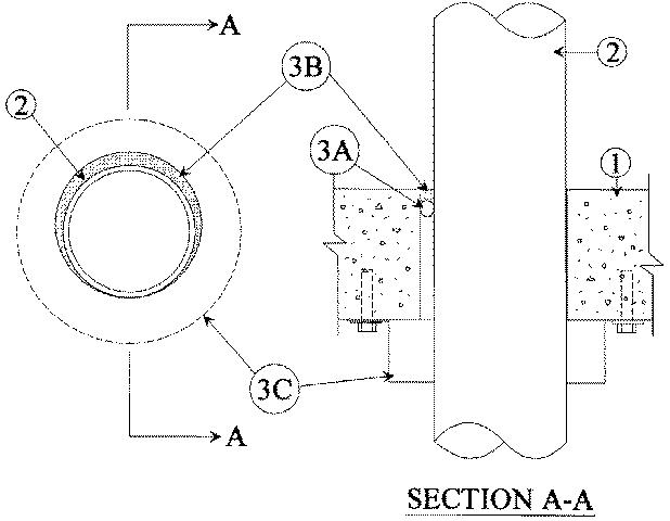 C.Firestop Device* — Galv steel collar lined with an intumescent material sized to fit specific diam of the through penetrant. Device to be installed around through penetrant in accordance with accompanying installation instructions. Device incorporates three anchor tabs for securement to underside of the concrete floor by means of 1/4 in. diam by 1-1/4 in. long steel expansion bolts in conjunction with min 3/4 in. diam washers. In walls, collars are installed on each side of wall.