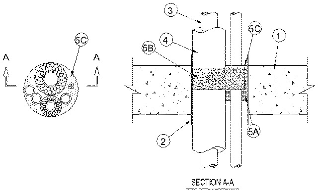 3.Through Penetrants — A max of four pipes, conduits or tubes and a max of four cable lengths to be installed within the opening. Annular space between the penetrants and the periphery of the opening shall be min 1/4 in. to max 1-1/2 in. Penetrants to be rigidly supported on both sides of floor or wall assembly. The following types and sizes of metallic pipes, conduits or tubing may be used:
