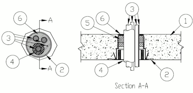 3.Through Penetrants (For use with HFP3, and HFP3B devices only) — Max of two of the same or different pipes, tubing to be bundled within the opening. The space between penetrants and the space between the penetrants and the inside of the firestop device (Item 2) at top of floor shall be min 1/4 in. (6 mm). Penetrants to be rigidly supported on both sides of floor assembly. The following types and sizes of penetrants may be used:A.Cross-Linked Polyethylene (PEX) Tubing — A max of two nom 1 in. (25 mm) diam (or smaller) SDR 9 PEX tubing for use in closed (process or supply) piping systems.B.Polyvinyl Chloride (PVC) Pipe — A max of two nom 1 in. (25 mm) diam (or smaller) Schedule 40 solid core PVC pipe, for use in closed (process or supply) piping systems.B1.Polyvinyl Chloride (PVC) Pipe — As an alternate to Item B, Max of two Nom 1 in. (25.4 mm) diam (or smaller) solid or cellular core Schedule 40 polyvinyl chloride (PVC) pipe.
