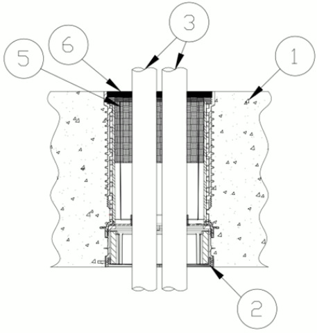 6.Fill, Void or Cavity Material* — Sealant — Min 1/4 in. (6 mm) thickness of sealant applied within the annulus, flush with the top surface of floor. Sealant to be forced into interstices of AC lineset to max extent possible. Config B Only Sealant to lap min 1/2 in. (13 mm) onto top surface of concrete around perimeter of firestop device. Note: Sealant is only required for HFP-H4 and HFP-H4B devices and only needed for L and/or W Ratings for all other HFP devices as described in both tables above.
