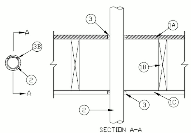 3.Fill, Void or Cavity Material- Caulk — Min 3/4 in. (19 mm) thickness of fill material applied within annulus, flush with top surface of floor and bottom of ceiling.