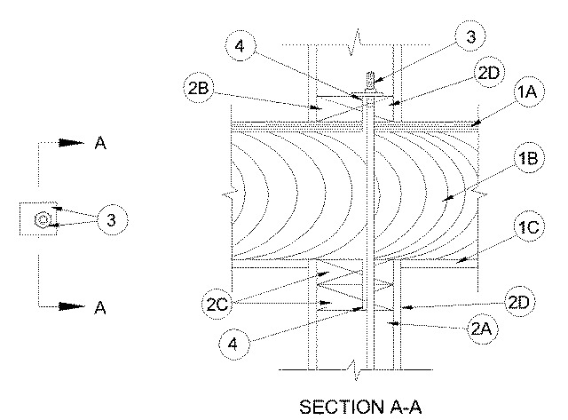 3.Through Penetrant — One min 1/4 in. (6 mm) diam galvanized wire rope to be installed either concentrically or eccentrically within the firestop system. The wire rope shall be coupled to a min 1/2 in. (13 mm) diam to max 1-1/2 in. (38 mm) diam threaded steel rod penetrating the sole plate on the top side of the floor-ceiling assembly or the top side of the top plate at the top of the wall. The annular space shall be 0 in. (point contact) to max 1/2 in. (13 mm). The threaded rod is secured to the sole plate or top plate with a steel nut in conjunction with a min 3 by 3 in. (76 by 76 mm) by 1/4 in. (6 mm) thick steel plate such that the length and width of the plate is min. 2 in. (51 mm) larger than the diameter of opening. Opening in steel plate sized to accommodate nom OD of through penetrant.