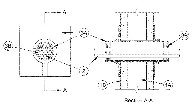A.Firestop Device* — Threaded steel sleeve halves incorporating split nuts and split washers sized to fit the specific diam of the opening. Device shall be installed around cables in accordance with the accompanying installation instructions. Device provided in nom 1, 2 and 4 in. (25, 51 and 102 mm) sizes. Max diam of opening in wall for 1, 2 and 4 in. (25, 51 and 102 mm) size devices are 1-1/4, 2-7/16 and 4-1/2 in. (32, 62 and 114 mm) respectively.